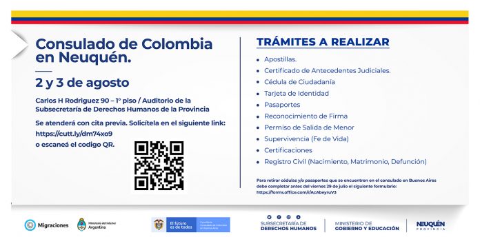 A partir de un trabajo realizado en conjunto con la Subsecretaría de Derechos Humanos, la Dirección Nacional de Migraciones y el Consulado de Colombia se logró concretar que la oficina itinerante atienda en la ciudad de Neuquén.
