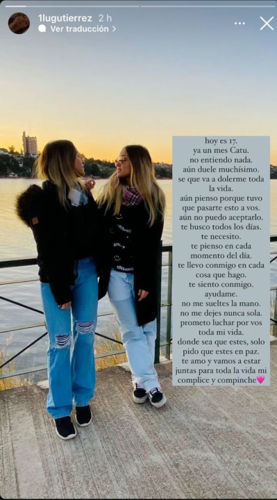 “Ya un mes Catu. No entiendo nada. Aún duele muchísimo. Sé que me va a dolerme toda la vida”, comenzó el mensaje publicado en su cuenta de Instagram. “Aún pienso por qué tuvo que pasarte esto a vos. No puedo aceptarlo. Te busco todos los días. Te necesito Te llevo conmigo en cada cosa que hago”, expresó.