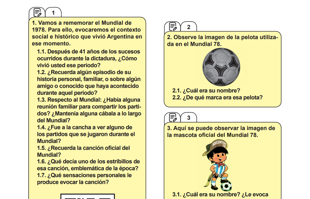 Al final de cada contenido se incluyeron preguntas para trabajarlo, por ejemplo, si la persona recuerda las reuniones familiares para ver los partidos del Mundial, si recuerda cábalas o cuál era el nombre de la pelota que se usó en la competencia.