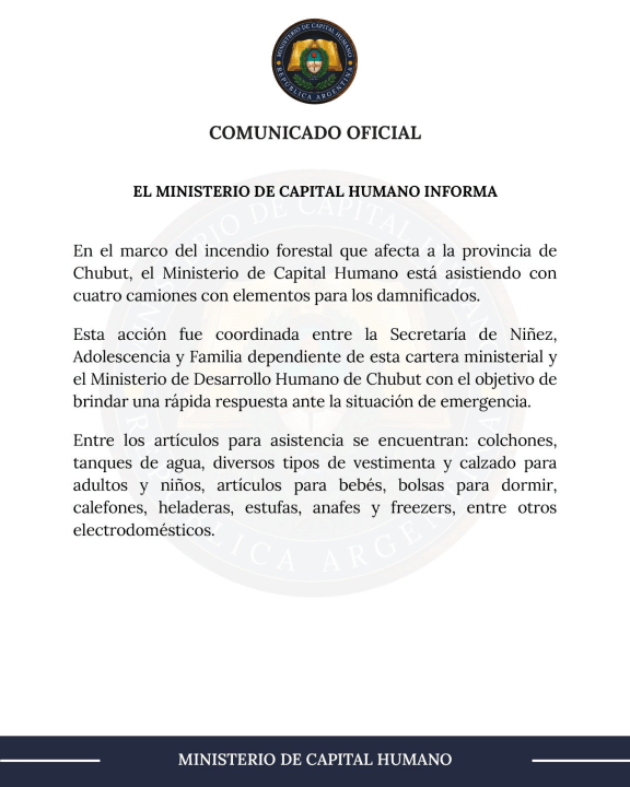 Desde el Ministerio de Capital Humano añadieron que asisten en la provincia de Chubut con «cuatro camiones con elementos para los damnificados».