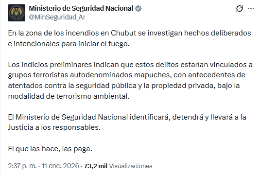 El Ministerio de Seguridad anunció que hay "indicios preliminares" que vincularían los incendios en la Comarca Andina a grupos "autodenominados mapuches". El jefe de Gabinete Manuel Adorni informó los recursos que dispuso el Ejecutivo. Trabajadores de parques nacionales que luchan contra los incendios reclamaron aumentos salariales.