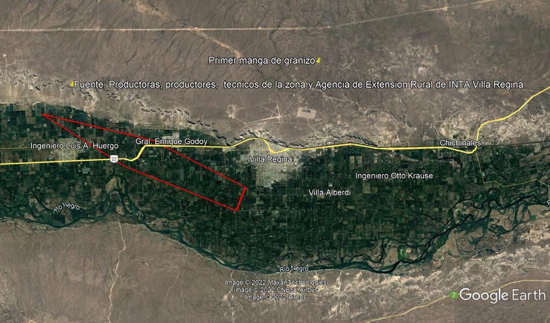 Un relevamiento realizado entre Regina y Huergo por las cámaras de productores locales mostró que la manga de lluvia y granizo abarcó desde el este de Regina hasta el norte de Huergo, con Godoy incluido.