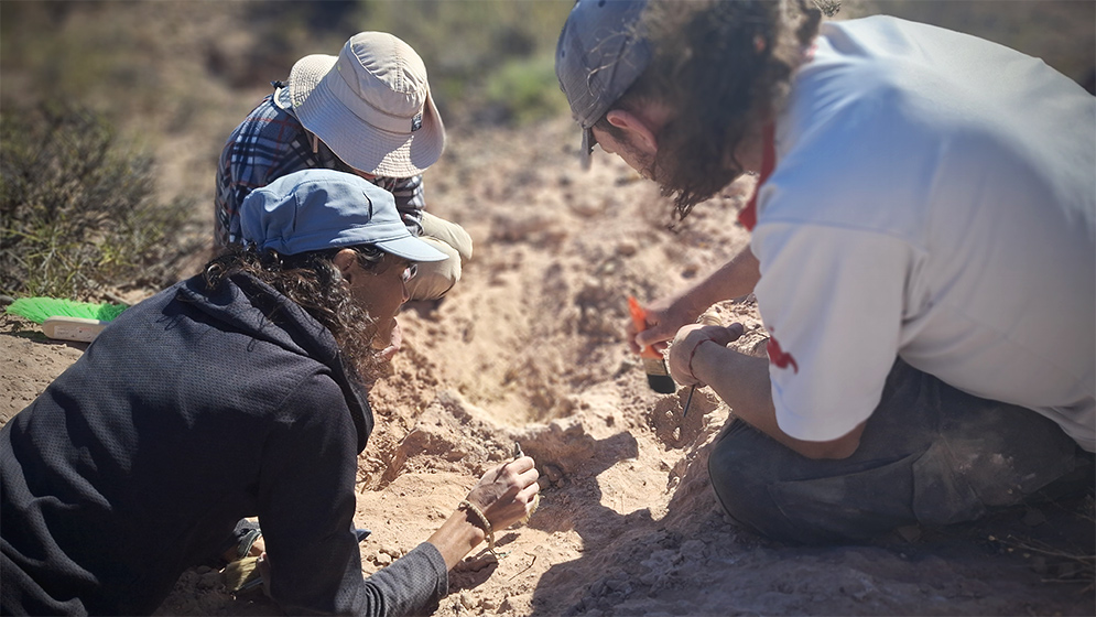 El descubrimiento comenzó casi de manera fortuita. Fue el becario posdoctoral Facundo Riguetti, quien identificó un fragmento de cráneo durante una recorrida de campo y dio aviso al equipo.