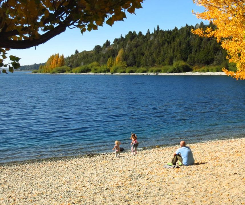 La playa más cercana es la que está en la bajada al Lago Moreno, a unos 300 metros del centro. Después, en el puente de la Angostura de los dos Morenos, donde comienza el río de Colonia Suiza, está la Playa del Viento, un lugar donde suele juntarse mucha gente. Queda a unos tres kilómetros.