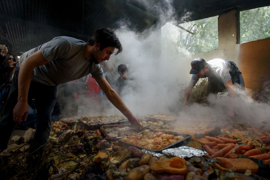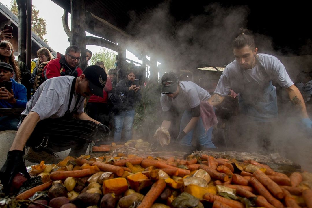 La preparación tiene algo de ceremonia colectiva. Primero se enciende el fuego y se calientan piedras bajo tierra. Después se acomodan las carnes, las verduras, las papas y los repollos. Todo se cubre con hojas y bolsas húmedas y se deja cocinar lentamente. La técnica, de origen araucano, fue introducida en la colonia por Emilio Goye, uno de los primeros pobladores de la zona, y con el tiempo se convirtió en una de las marcas identitarias del lugar.