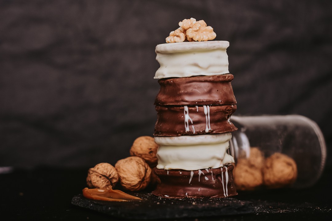 Una tarde, en plena pandemia por Covid-19, sintió ganas de comer un alfajor. Decidió que no saldría a comprarlo sino que lo haría con los ingredientes que tenía a mano: dulce de frambuesa, dulce de leche, cacao y chocolate semiamargo. Con el encierro, tiempo le sobraba.