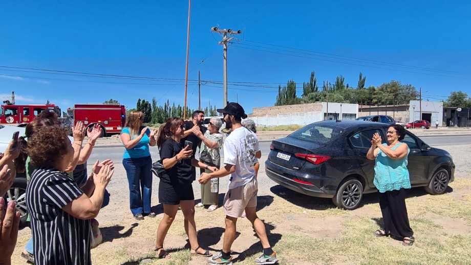 En la conocida torre de YPF, en el ingreso a Plaza Huincul, a la vera de la Ruta 22, llegó el campeón. Al bajar de la camioneta en la que viajaba, Máximo recibió el aplauso y las felicitaciones de sus familiares, amigos, compañeros y vecinos que se acercaron.