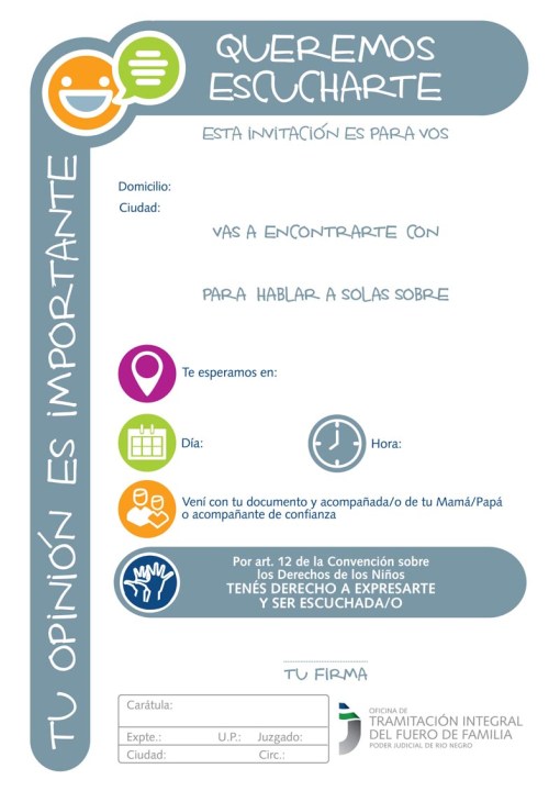 “Queremos escucharte. Esta invitación es para vos. Tu opinión es importante”, dice la notificación que para los más pequeños se asemeja más a una grata invitación, con emojis, colores y lenguaje directo y sencillo; dejando atrás el ninguneo y el ruido en la comunicación entre las infancias y el Poder Judicial.