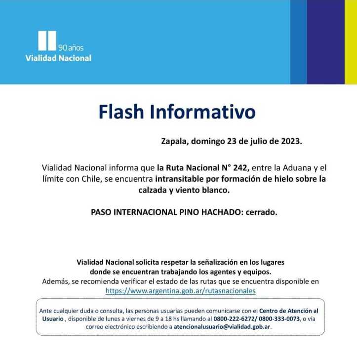 Por su parte, el paso internacional Pino Hachado, que conecta a Chile por el centro de la provincia, ya había permanecido cerrado durante las primeras horas de ayer sábado, para luego de las 11:30 habilitarlo a la circulación.