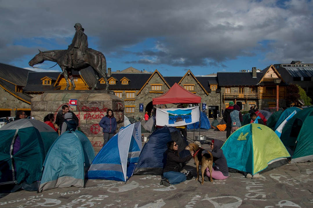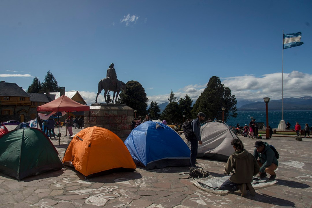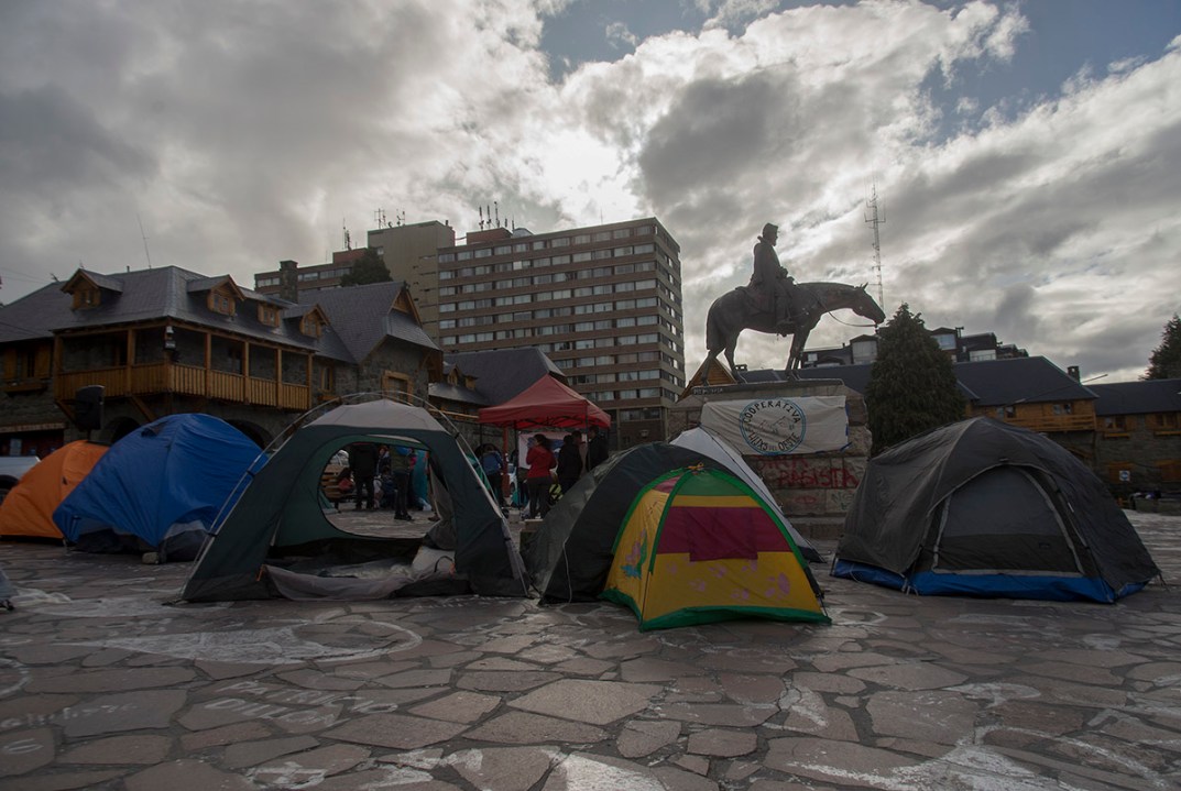 El viento soplaba con fuerza esta tarde de sábado sobre las carpas que habían montado en el Centro Cívico de Bariloche. La escena sorprendía a turistas y residentes por igual, en una tarde gris y fría. Pocas veces ese punto neurálgico de la ciudad muestra una postal de un drama social que afecta a miles de personas que no tienen posibilidades del acceso a la tierra. Mucho menos a una solución habitacional.
