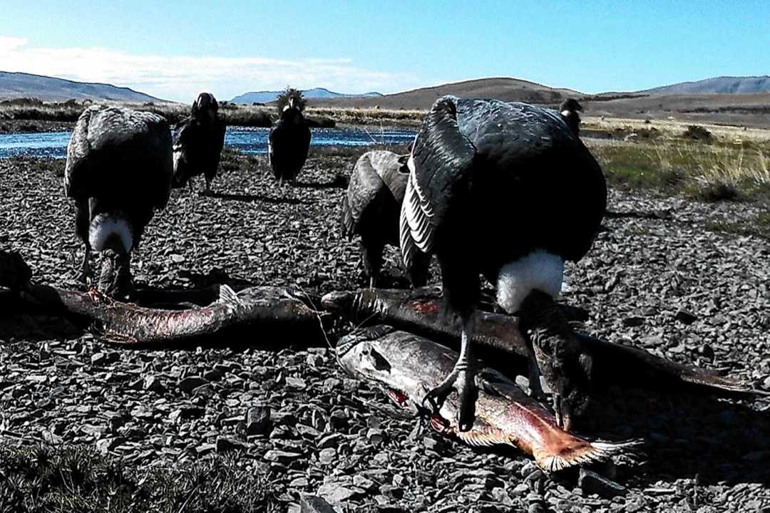 En sectores del río Santa Cruz, se contabilizaron hasta 20 toneladas de carcasas de salmón. Es un banquete para las especies carroñeras: se ha integrado en la dieta de cóndores, águilas mora, zorros y caranchos. Estos fueron captados por cámaras trampa colocadas por Ciancio y colaboradores a lo largo del cauce del río para poder estudiar con precisión el comportamiento.