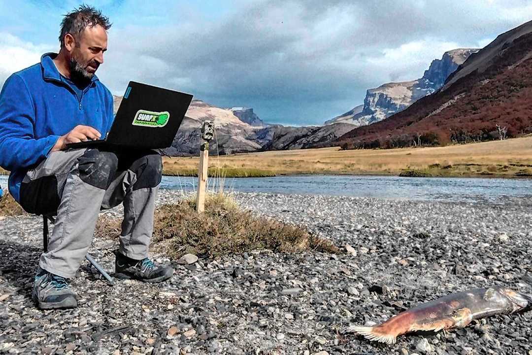 “Estamos trabajando junto con ONGs como la Fundación Anfibia, la Secretaría de Pesca de Santa Cruz y APN, con el apoyo de Patagonia CO y en algunos ríos donde realizamos censos con drones estimamos hasta 20 toneladas de carcasas en un sector muy pequeño del río”, explica el investigador.