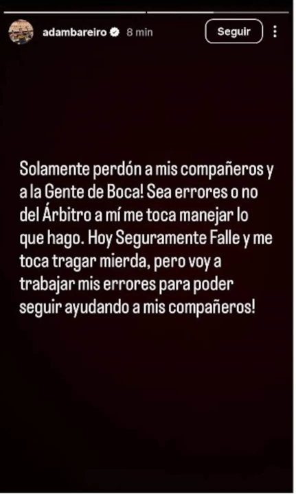 “Solamente perdón a mis compañeros y a la gente de Boca. Sea errores del árbitro o no, a mí me toca manejar lo que hago. Hoy seguramente fallé y me toca tragar mierda, pero voy a trabajar mis errores para poder seguir ayudando a mis compañeros”, escribió.