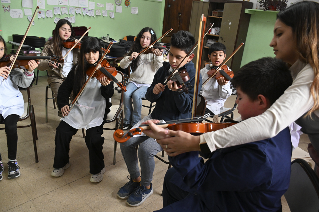 Abi, Jael, Sofi, Julia, Thiago, Emanuel, Joaquín, Tami y Keira observaron a Lucía y copiaron su postura como si se dispusieran a tocar. Para la amplia mayoría de los alumnos de sexto grado de la Escuela 266 era la primera vez que tenían entre sus manos un violín tan bello.