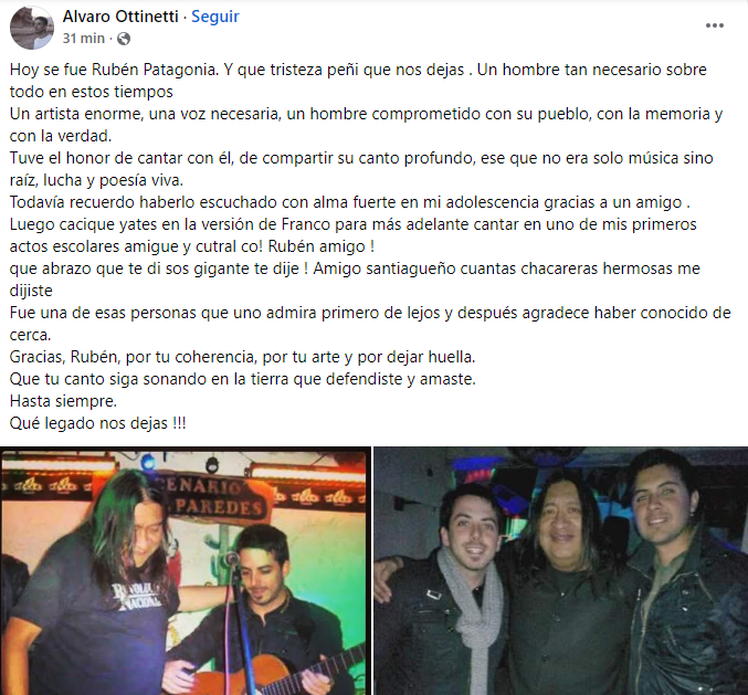 «Hoy se fue Rubén Patagonia. Y que tristeza peñi que nos dejas. Un hombre tan necesario sobre todo en estos tiempos. Un artista enorme, una voz necesaria, un hombre comprometido con su pueblo, con la memoria y con la verdad», escribió Alvaro Ottinetti, un músico de Santiago del Estero, quien compartió fotos junto al cantante patagónico. Ottinetti recordó: «Tuve el honor de cantar con él, de compartir su canto profundo, ese que no era solo música sino raíz, lucha y poesía viva. Todavía recuerdo haberlo escuchado con Almafuerte en mi adolescencia gracias a un amigo. Luego cacique yates en la versión de Franco para más adelante cantar en uno de mis primeros actos escolares amigue y cutral co! Rubén amigo que abrazo que te di sos gigante te dije. Fue una de esas personas que uno admira primero de lejos y después agradece haber conocido de cerca. Gracias, Rubén, por tu coherencia, por tu arte y por dejar huella. Que tu canto siga sonando en la tierra que defendiste y amaste. Hasta siempre».