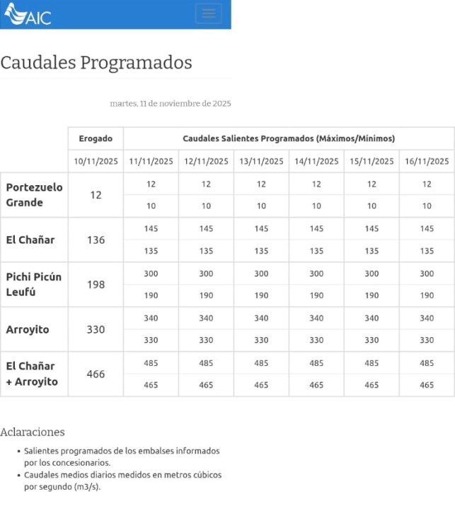Si se repasan los caudales programados por la Autoridad Interjurisdiccional de Cuencas para esta semana se observa que en el río Neuquén se proyecta erogar, desde el compensador de El Chañar, de 135 a 145 (mínimo y máximo) de metros cúbicos por segundo. En el río Limay, que se eroga desde Arroyito, el caudal saliente programado es de 330 a 340 (mínimos y máximos) de metros cúbicos por segundo. “Son caudales bajos que responden a una erogación ecológica, el mínimo que se puede erogar”, explicó Baggio.