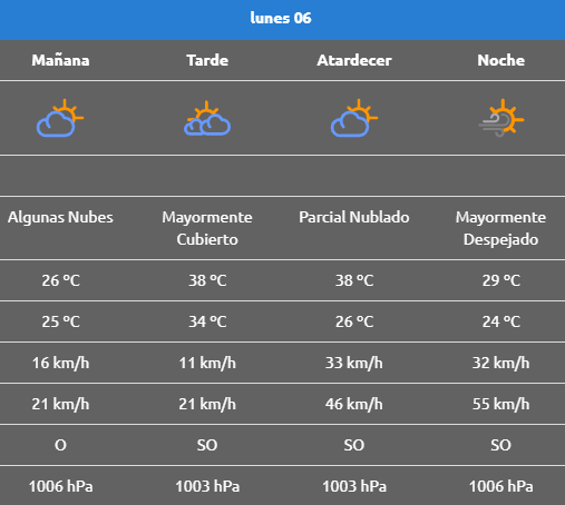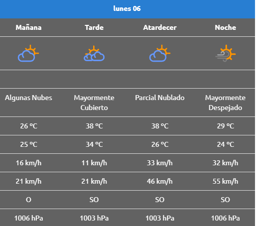 Las temperaturas oscilarán entre los 25ºC por la mañana y los 38ºC por la tarde. El viento soplará con ráfagas moderadas que podrían alcanzar los 21 km/h durante el día, intensificándose en la noche con ráfagas de hasta 55 km/h.