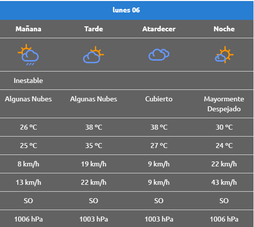 Por la mañana, el clima comenzará con una temperatura mínima de 25ºC, y se esperan vientos suaves del sur-suroeste a 16 km/h. Durante la tarde, la temperatura ascenderá hasta los 38ºC, con ráfagas de hasta 46 km/h.
