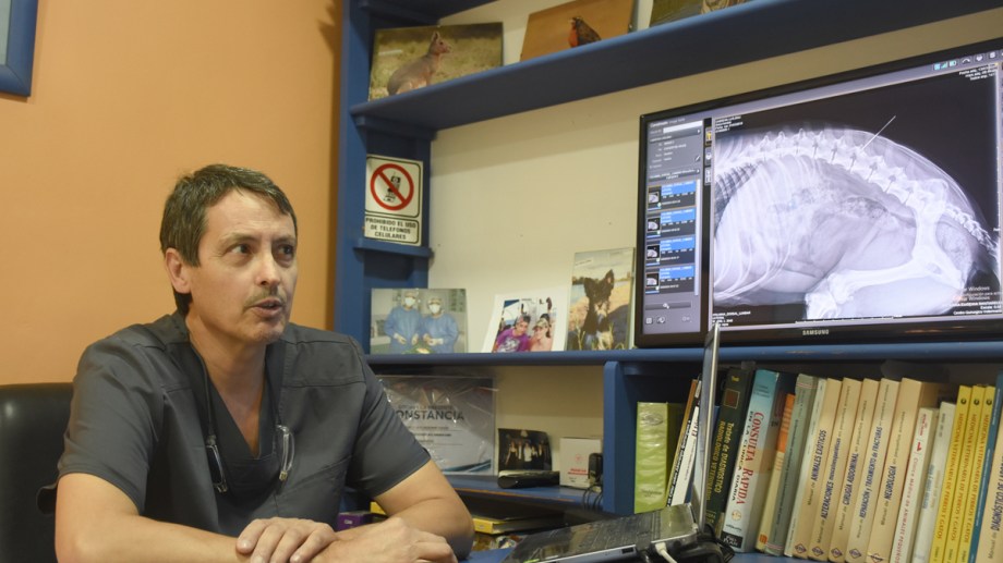 El profesional de Roca salió del quirófano el miércoles luego de operar la columna vertebral de un perro por una hernia discal, el próximo turno de cirugía era para un gato por fracturas múltiples. Perros y gatos ingresan constantemente a la sala completamente esterilizada, con los más diversos diagnósticos e historias.