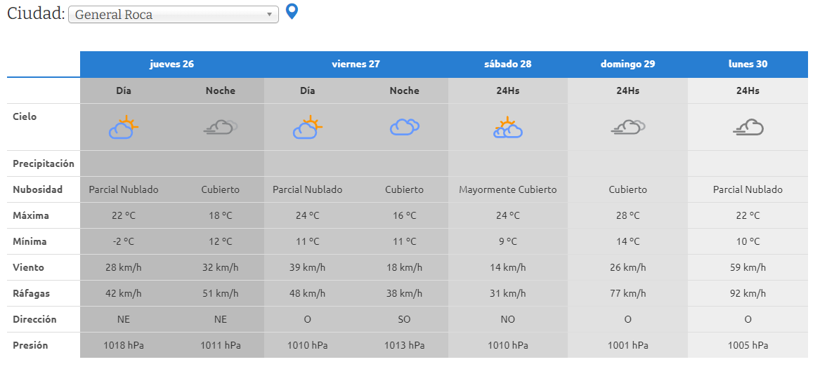 Para Neuquén, según el pronóstico extendido de la AIC, el sábado se esperan ráfagas de 26km/h y el domingo 29 de septiembre de 101 km/h. Para el lunes, viento a 52 km/h y ráfagas a 80 km/h.