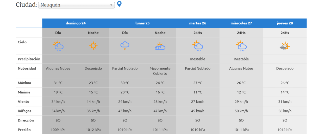 Este sábado, la temperatura en Neuquén tendrá 9° C de mínima y 30° C de máxima. Habrá vientos leves. El domingo aumentará la intensidad de las ráfagas. En Roca, de igual modo, este sábado la temperatura alcanzará los 30°C.