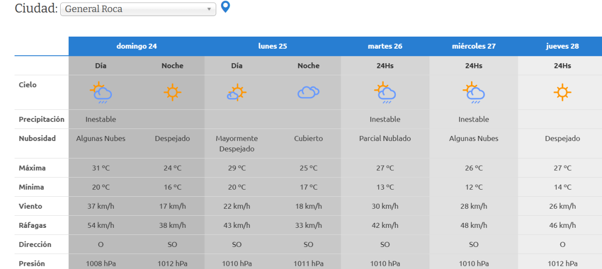 Para el martes y miércoles se esperan jornadas inestables, por lo que podría llover. En Roca, también, podría haber precipitaciones el domingo.