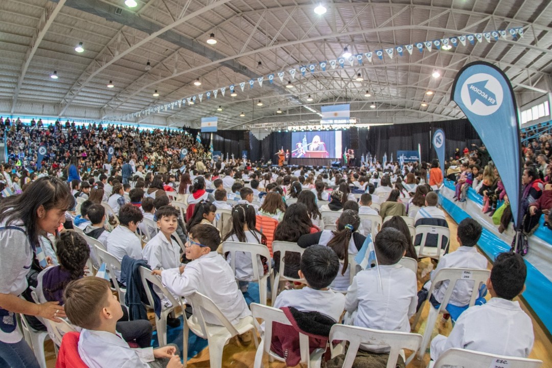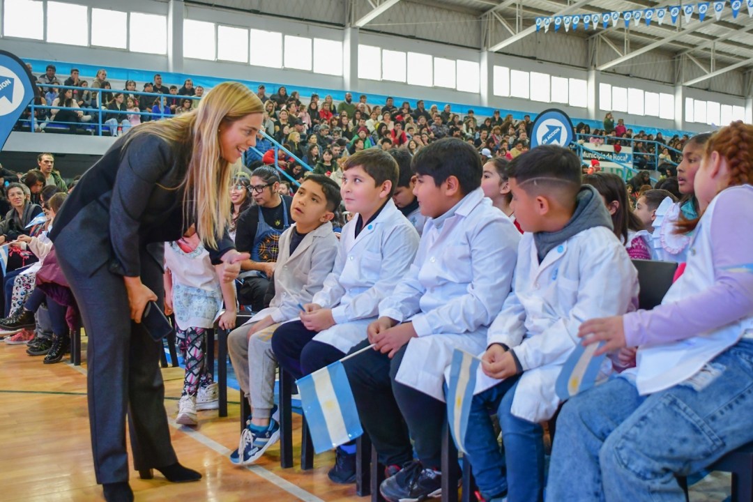 El acto celeste y blanco estuvo presidido por la intendenta de Roca, María Emilia Soria, quien aseguró que este 2023 se batió un récord en la cantidad de niños y niñas participantes.