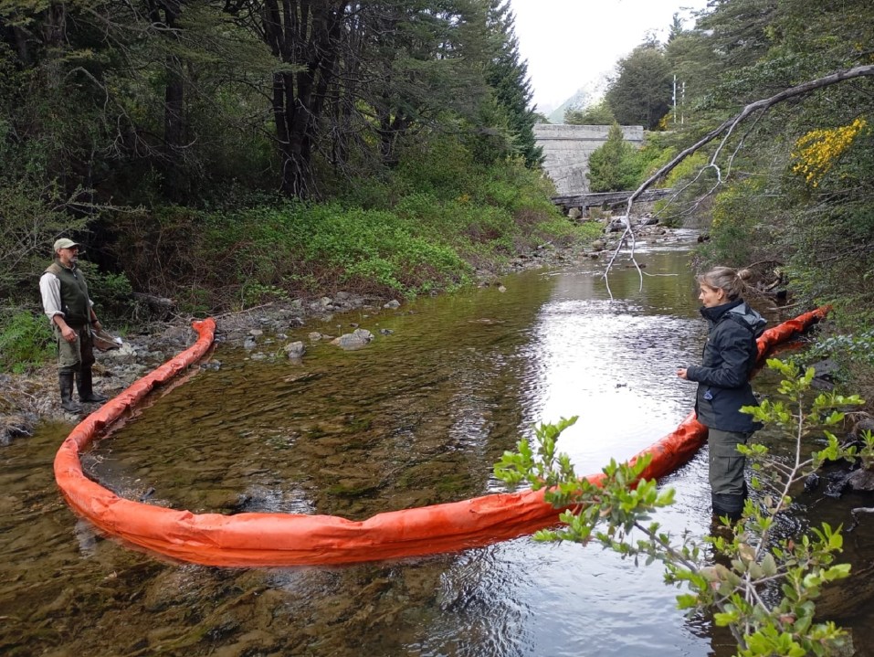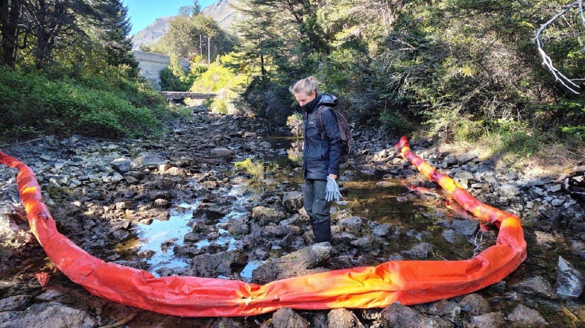 Técnicos y guardaparques del Parque Nacional Nahuel Huapi buscan contener la pérdida de fluidos cerca de Villa Mascardi. Usaron barreras especiales y paralizaron el ingreso de agua mediante las compuertas del dique.