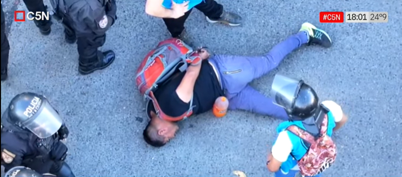 Desde el medio Resumen Latinoamericano captaron el momento en el que una agente atrapa al reportero gráfico agarrándolo desde su mochila y lo redujeron al piso. El mismo luego se identificó ante la prensa como Fabricio Fisher.