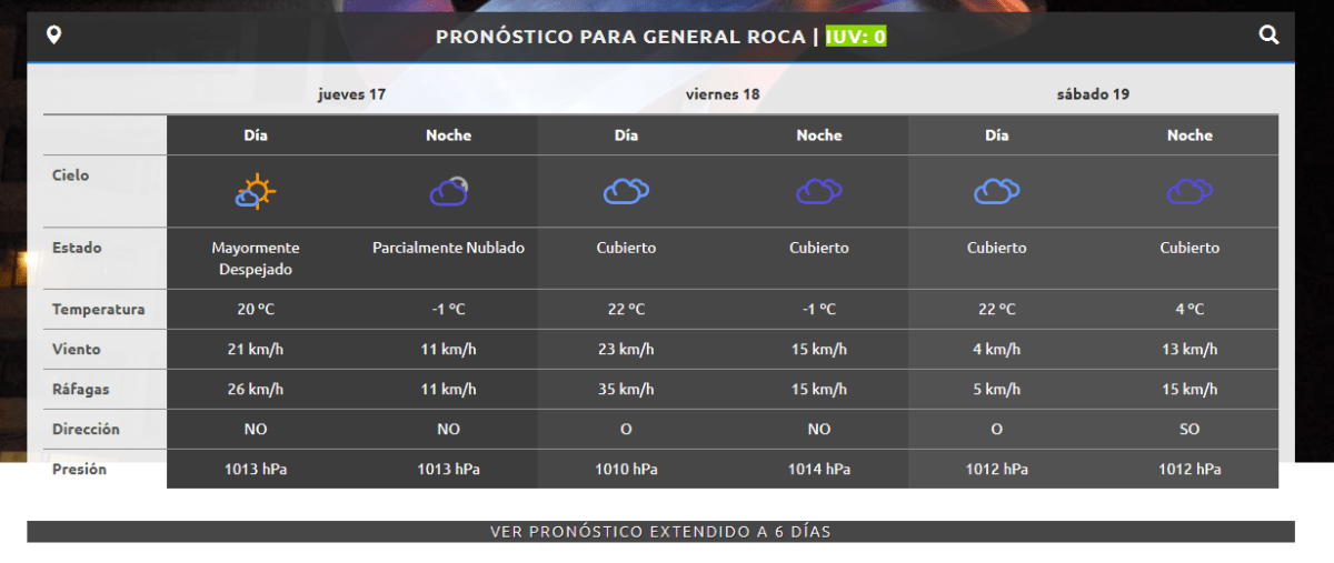 - Viernes: -1°C a 22°C | cielos cubiertos | ráfagas de hasta 35 kilómetros que se harán más leves por la noche.