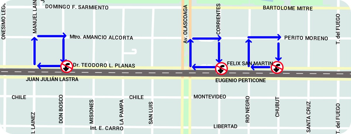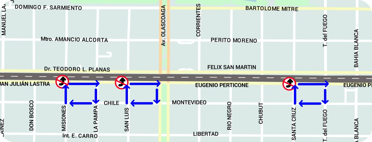 Desde octubre, estarán prohibidos los giros a la izquierda en las calles Don Bosco, Misiones y San Luis (en el margen oeste de la Avenida Olascoaga), y en Corrientes, Chubut y Santa Cruz (en el margen este de la Avenida Olascoaga). Esta medida busca mejorar el flujo vehicular en estas áreas, permitiendo realizar retornos por la manzana para cruzar la Avenida Mosconi.