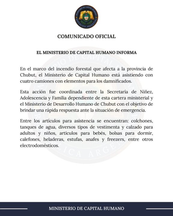 “Lo que está ocurriendo en Chubut es lamentable. Estos incendios están destruyendo bosques, infraestructura y poniendo en riesgo a la población”, expresó Monteoliva, quien remarcó que desde el inicio de la emergencia el Ministerio de Seguridad trabaja de manera coordinada con la Agencia Federal de Emergencias (AFE) y las autoridades provinciales.