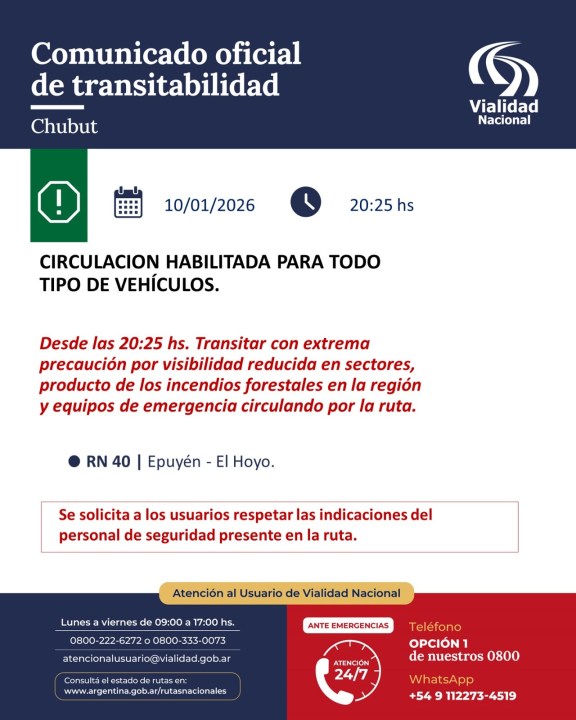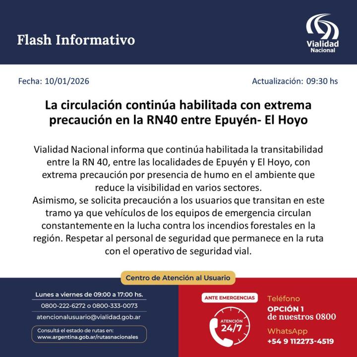 Vialidad Nacional informó que el corte rige «hasta nuevo aviso«. Se prohibió la circulación para todo tipo de vehículos por aproximación del fuego a la calzada. Aclararon que la Policía y la Agencia Nacional de Seguridad Vial (ANSV) controlan el paso de vecinos que están colaborando y fuerzas de seguridad que trabajan en el lugar.