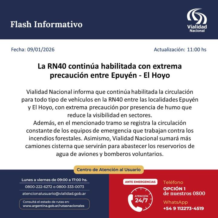 El organismo indicó que la situación está directamente vinculada al avance de los incendios forestales en la región, lo que también genera una circulación constante de equipos de emergencia que trabajan en el combate del fuego. Por este motivo, se solicita a los conductores respetar las indicaciones del personal y extremar las medidas de seguridad al circular.