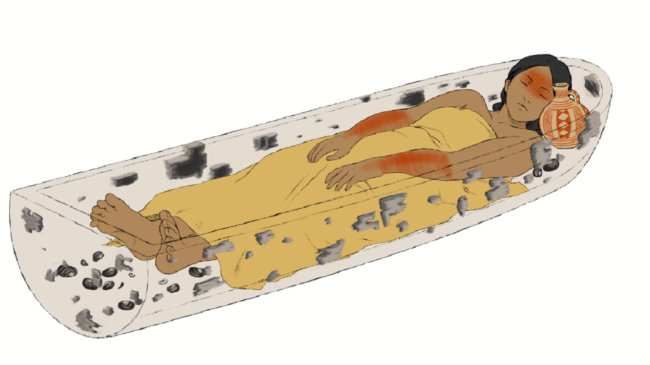 El cuerpo encontrado fue denominado como “Individuo tres” y data alrededor del 1100, es el más antiguo de los encontrados previamente en el mismo sitio. Estaba extendido de forma recta y su cráneo y antebrazos estaban decorados con tinta roja. Además, tenía un jarro de cerámica con dibujos tradicionales en rojo y blanco. El cuerpo yacía sobre moluscos y estaba rodeada por priezas de madera.