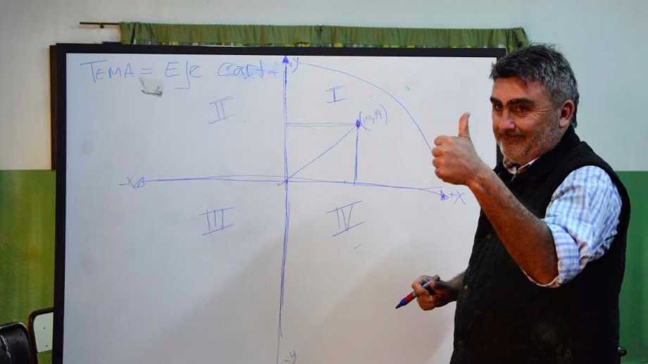 En un pizarrón con una tiza blanca escribe el tema de la clase y traza dos líneas que se cruzan. En vez de explicarlo de una forma clásica, canta al ritmo de «No te creas tan importante», del grupo de cumbia Damas Gratis: «¿Qué son los ejes, qué son los ejes cartesianos y me dicen, que son dos rectas que se cortan por el centro y dividen en cuatro partes, cuatro cuadrantes». Así comienzan las clases Raúl Mohamen, un profesor de matemáticas en la ESRN 150, en Roca.