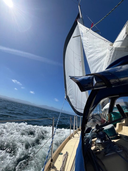 En medio del océano, debió atravesar una tormenta que se extendió por durante dos días. “Cuando uno se lanza, busca los pronósticos y si bien daban viento, fue mucho más intenso. Mi barco era pequeño, pero se lo bancó”, advierte. Eugénie había leído libros, había visto videos de regatas para conocer cómo se manejaban los barcos ante una tormenta. “Hay que reducir la vela porque, de esta forma, el viento pega menos y el barco no pierde tanto balance. En mi velero, saqué la vela de adelante y reduje la vela grande atándola muy bien. Dio resultados porque el barco ni se inmutaba. La que tenía miedo era yo con esas olas de 5 o 6 metros”, recuerda.