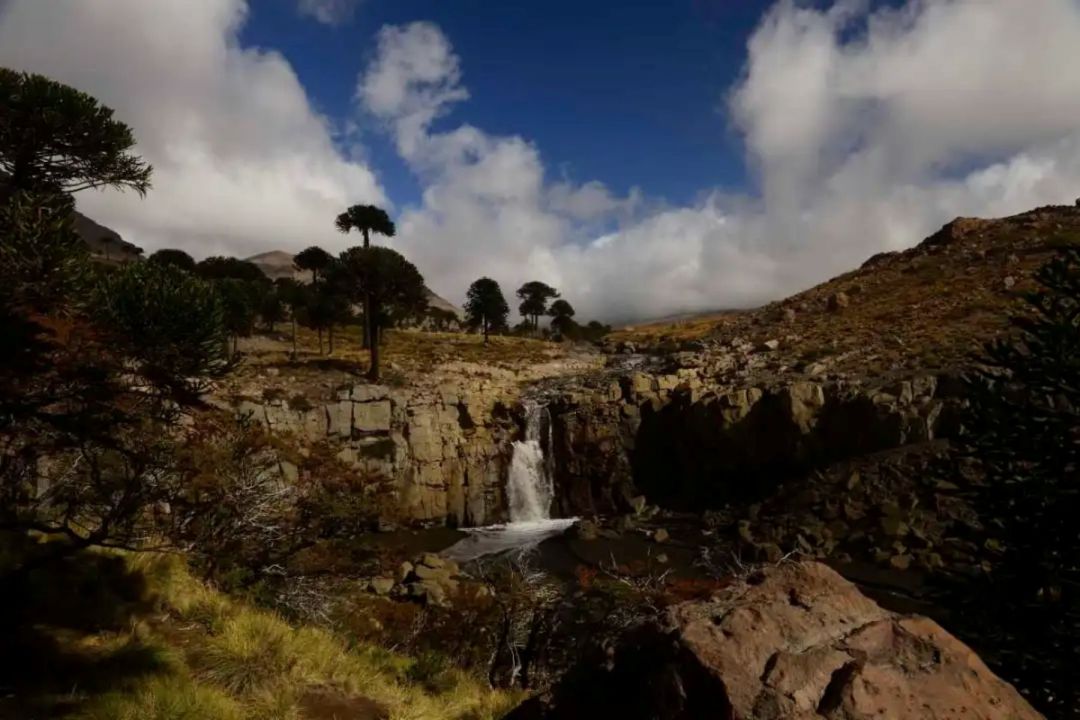 La caminata continúa hasta la Cascada de la Culebra, donde el salto nace a mitad del paredón. Allí, el paisaje cambia: las araucarias, los pehuenes, dominan el horizonte. Sus piñones, base alimentaria histórica de la región, conectan el recorrido con la cultura del lugar.
