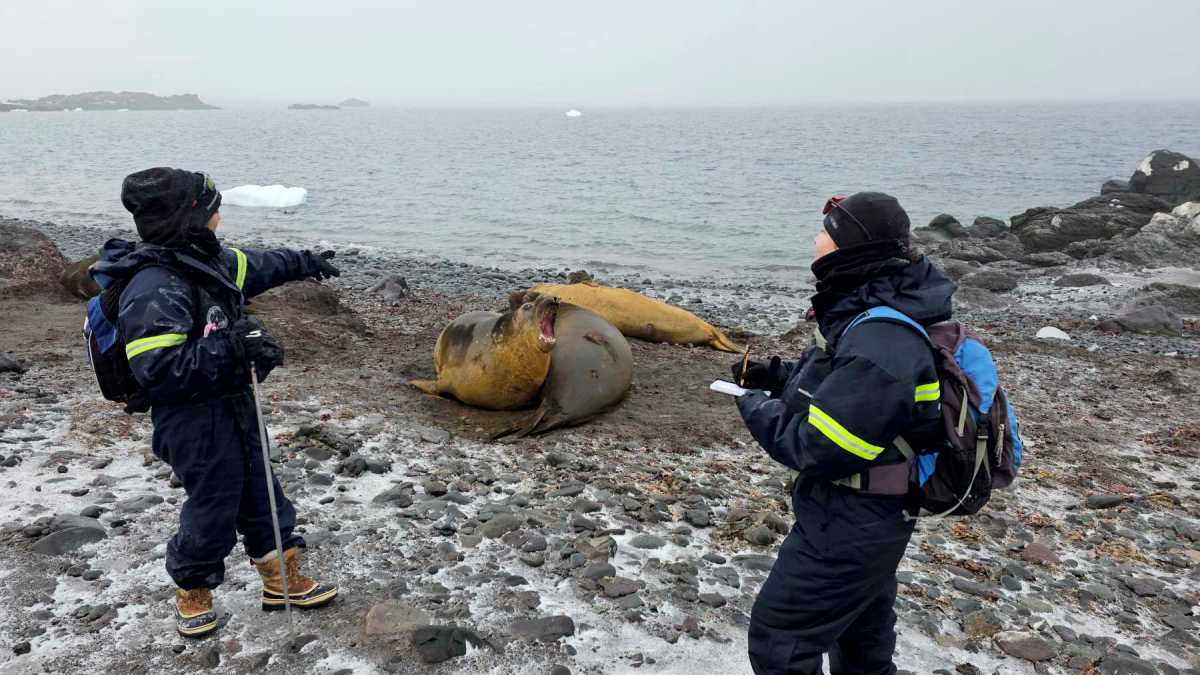 Biólogas invernantes en censo costeros de mamíferos marinos. Recorren 7 kilómetros con elefantes, lobos y focas. Foto: Micaela Presti.