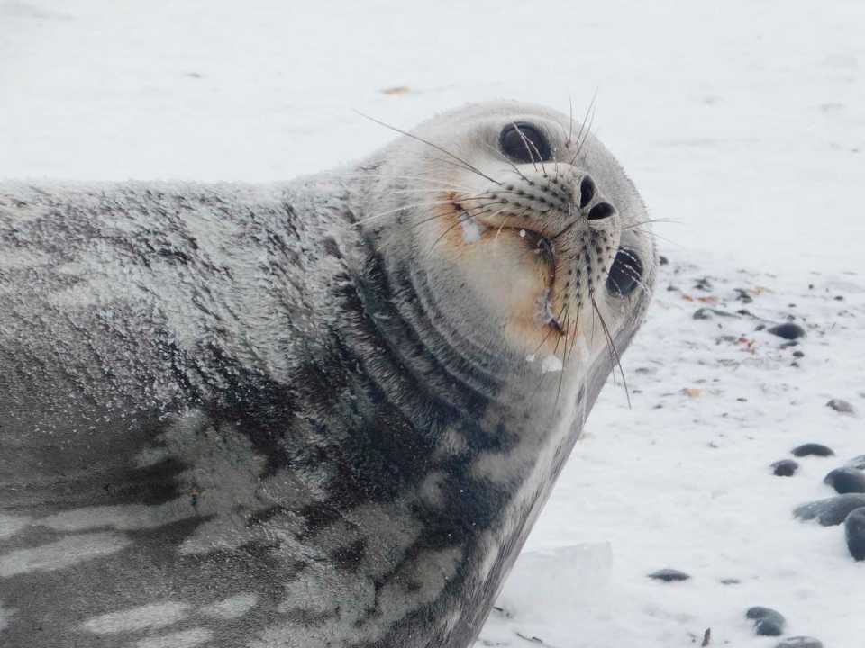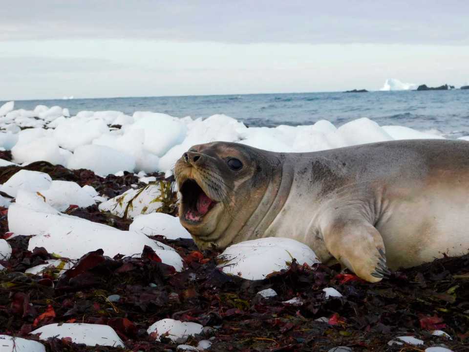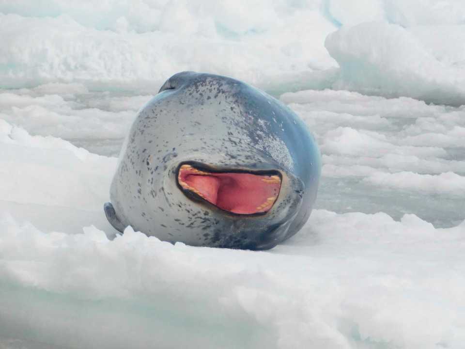 Foca leopardo descansando sobre un bandejón de hielo marino. Foto: María Luss Salatino.