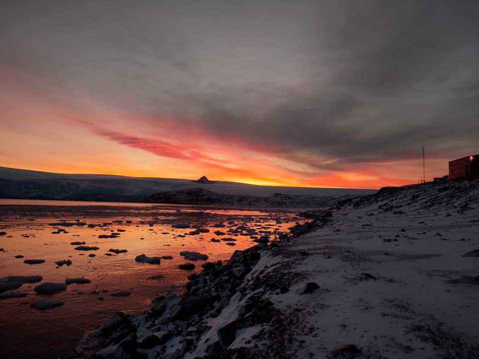 Amanecer de colores junto al glaciar Fourcade y el nunatak “Yamaná”. Foto: María Luss Salatino.