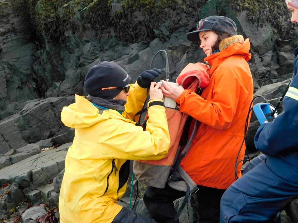 Biólogas invernantes realizando muestreo sobre macroalgas en el intermareal. Foto: Enzo Pereyra.