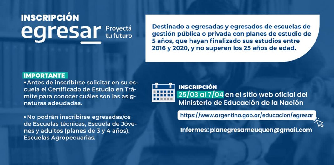 Desde el 25 de marzo y hasta el 7 de abril, se encuentran habilitadas las inscripciones para el plan nacional Egresar 2022. Las inscripciones se realizan únicamente completando el formulario online en la página del Ministerio de Educación de la Nación.