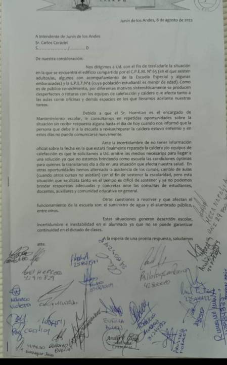Ayer, los estudiantes del CPEM 65 redactaron una nota con los reclamos que tiene el establecimiento que comparte lugar con la EPET 4 de Junín de los Andes. La misma está dirigida al intendente Carlos Corazini, aunque también será enviada a otros espacios.