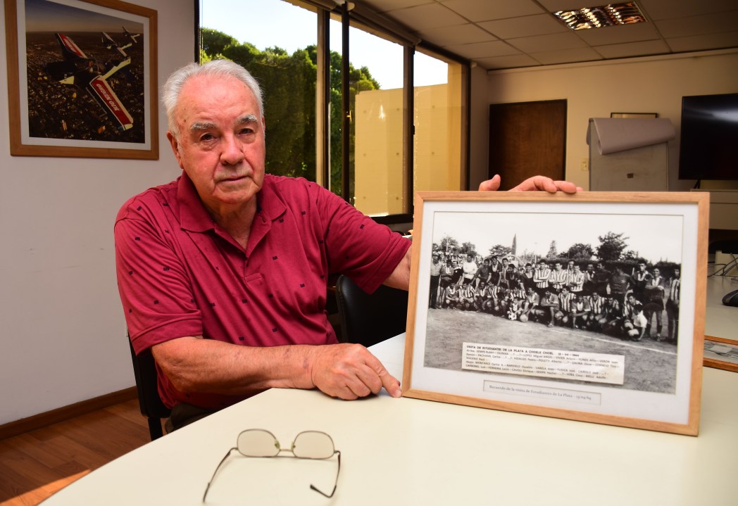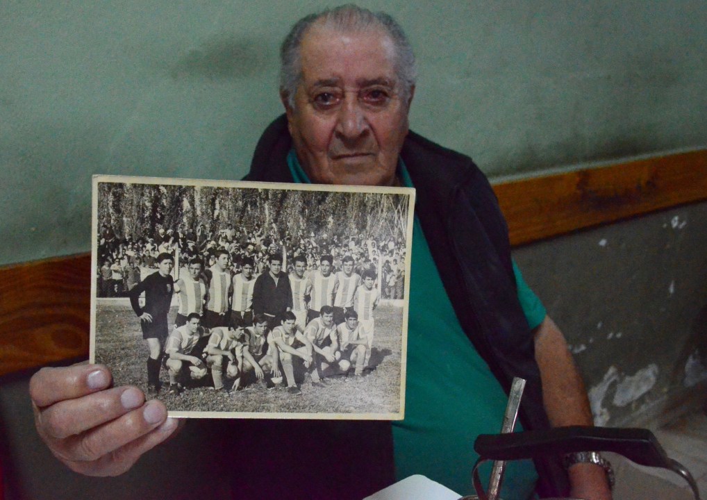 Oscar “Pochiquín” Gauna tiene 78 años y muy buena memoria. Mientras le cuenta a Río Negro, enseña el cuadro con la foto del partido en Choele. Lo jugó como refuerzo de Sportsman, tenía 19 años y era el firme zaguero de Beltrán .