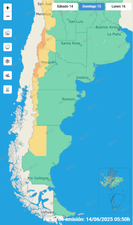 - Bariloche – Cordillera de Pilcaniyeu – Cordillera de Ñorquinco: alerta amarillo para el domingo durante la madrugada por nevadas.