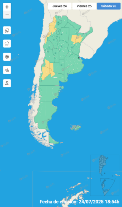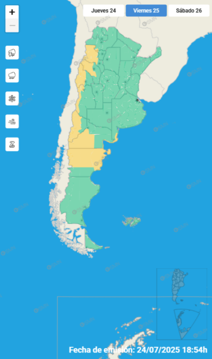 Para este viernes 25 de junio, el organismo nacional emitió alerta amarilla por nevadas de variada intensidad. En las zonas cordilleranas, se aguardan valores de nieve acumulada entre 20 y 40 centímetros; en las zonas llanas y meseta, esperan entre 10 y 15 centímetros.