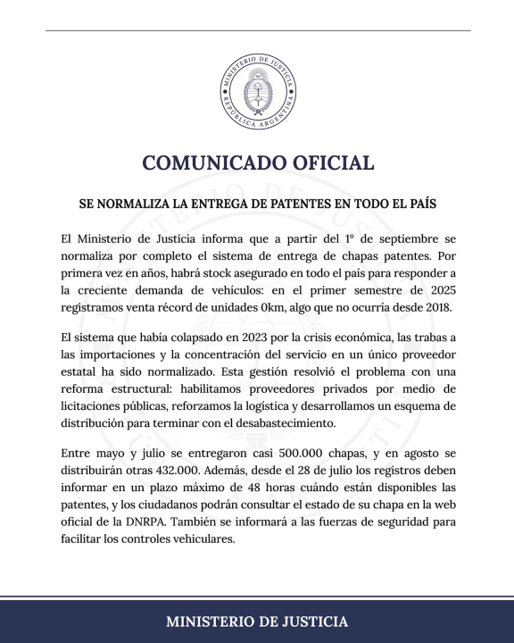 El gobierno de Javier Milei anunció que normalizará por completo la entrega de chapas patentes en todo el país, poniendo fin a una problemática que afectó a miles de propietarios de vehículos desde 2023 en adelante.