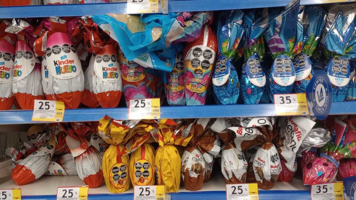 En este caso, indicaron que aplica en todos los huevos y figuras de Pascua. Por ejemplo, una gallina o conejito de chocolate con el descuento aplicado quedaría aproximadamente en $2.325. Asimismo, un huevo de 80 gr tiene un valor de $3.600.