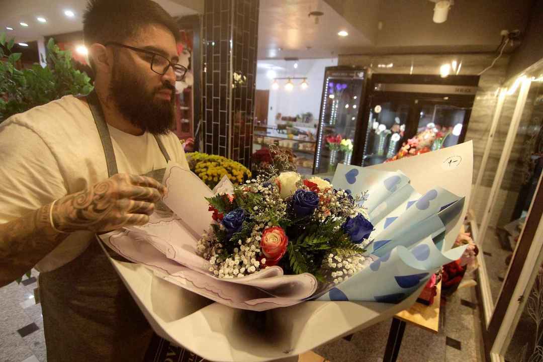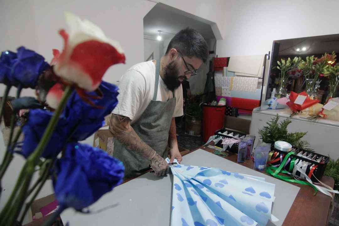 Alrededor de las rosas, se mezclan otras flores, cintas y papeles que completan arreglos pensados para este día festivo, en una secuencia que se repite en cada local de la capital.